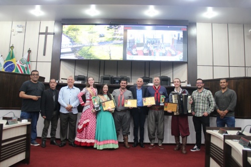 A entrega de moções reuniu Marcelo Moresco, patrão do CTG Província Gaúcha; Luciano Tusset, patrão do CTG Chama Crioula, e Agnaldo Isidoro Rodrigues, vice-patrão do CTG Estância da Liberdade, além dos integrantes das respectivas invernadas artísticas premiadas, e o vereador Pedro Varela, que propôs a homenagem - também assinada por demais vereadores.