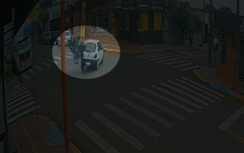 Uma câmera de segurança registrou o momento em que uma motocicleta colidiu contra a lateral de um carro, no início da tarde deste sábado (06), em Toledo. O acidente ocorreu no cruzamento das ruas Primeiro de Maio e Felipe Camarão, na Vila Pioneiro, e deixou um homem ferido.