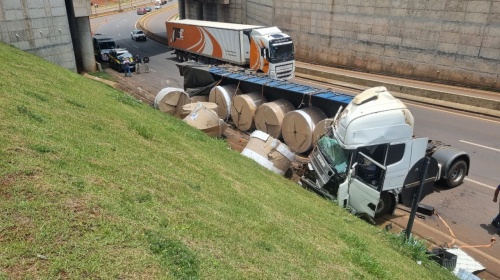 Segundo as informações, o veículo realizava o contorno quando a carreta pendeu para a direita e bateu contra a mureta de proteção da estrutura do trevo.