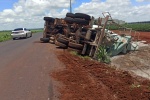 O caminhão ficou tombado, causando danos significativos à estrutura do veículo. Apesar da gravidade do acidente, felizmente, não houve registro de feridos.