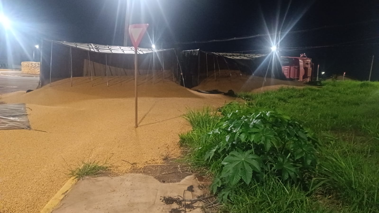 Caminhão carregado com grãos tomba em rotatória, em Toledo