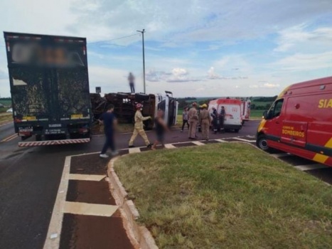 Conforme as informações, um caminhão de ração foi acessar a PR-581 e, ao tentar atravessar a PR-239, foi atingido por um caminhão baú, que seguia no sentido de Toledo à Assis Chateaubriand. Com a forte batida, o caminhão de ração acabou tombando.