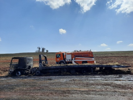 Caminhão de Toledo é consumido por chamas na PR-585 entre São Pedro do Iguaçu e Vera Cruz do Oeste