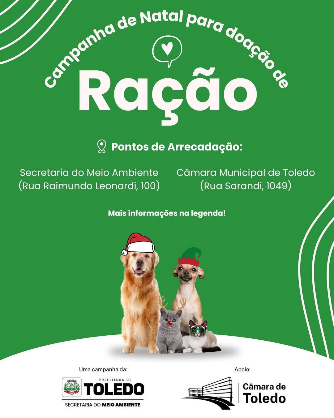 A Secretaria do Meio Ambiente, em parceria com a Câmara Municipal de Toledo, realiza uma campanha de arrecadação de ração voltada a animais em situação de abandono. As doações podem ser feitas até o dia 16 de dezembro na sede do Legislativo, localizada na Rua Sarandi, Nº 1.049, e na Secretaria do Meio Ambiente, na Rua Raimundo Leonardi, Nº 100, ambas no Centro da cidade.