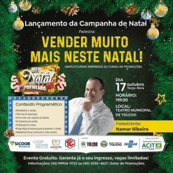Com o tema “Vender muito mais neste Natal”, a palestra será ministrada por Itamar Ribeiro, que possui mais de 20 anos de carreira como palestrante nas áreas de vendas, liderança, qualidade de vida e produtividade.