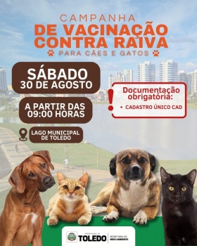 A Prefeitura de Toledo realiza neste sábado (30) a campanha de vacinação contra a raiva para cães e gatos. A ação será realizada a partir das 09h00, no Parque Ecológico Diva Paim Barth (Lago Municipal de Toledo).