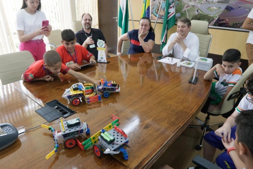 A Prefeitura de Toledo, por meio da Secretaria Municipal de Educação (Smed), realizou o Campeonato Municipal de Robótica Educacional envolvendo participantes das 36 escolas municipais. Nesta quarta-feira (29), os alunos vencedores da competição foram recebidos e homenageados pelo prefeito Beto Lunitti na Sala de Reuniões da Prefeitura. A secretária de Educação, Marli Gonçalves Costa, e os coordenadores do Setor de Robótica da Smed também participaram da homenagem.
