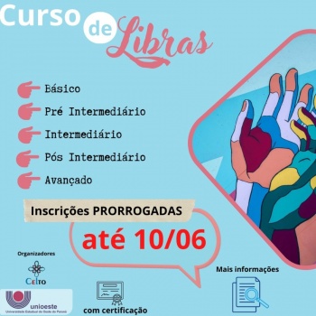 Estão abertas as matrículas para o curso de Língua Brasileira de Sinais - Libras da Universidade Estadual do Oeste do Paraná (Unioeste), campus de Toledo. As inscrições vão até o dia 10 de junho e são ofertados o curso: Básico, Pré-Intermediário, Intermediário, Pós-Intermediário e Avançado.