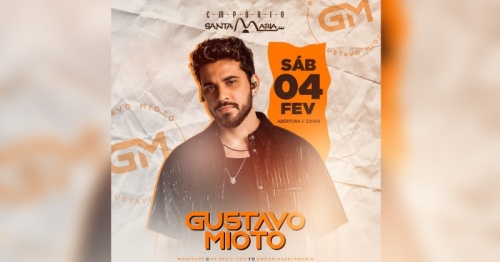 Final de semana está se aproximando, e se você ainda não tem planos para o sabadão, que tal curtir mais um mega show no Empório Santa Maria de Toledo com aquela pessoa especial ou com os amigos? Desta vez, quem sobe ao palco da melhor casa de shows da região, é o cantor GUSTAVO MIOTO!