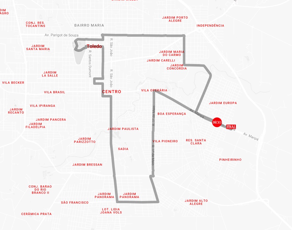 O trajeto inclui bairros como Jardim Europa, Jardim Concórdia, Jardim Porto Alegre, Centro, Vila Paulista, Jardim Panorama, Vila Pioneiro e Vila Operária. A caravana começa na Avenida Maripá e percorre importantes vias, incluindo Avenida Parigot de Souza e Rua Barão do Rio Branco, além de realizar uma passagem especial pelo Parque Ecológico Diva Paim Barth, o Lago Municipal de Toledo.