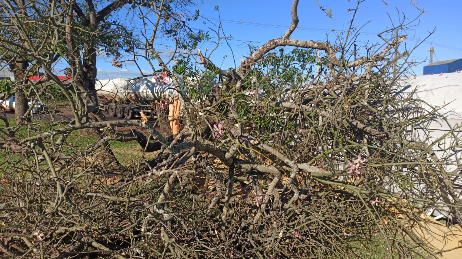 Carreta tomba e derruba árvore na PR-182, entre Toledo e Maripá