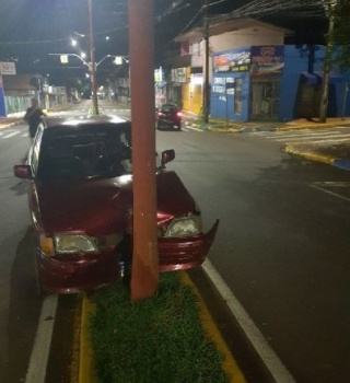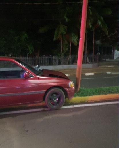 Um veículo Ford Escort, de cor vermelha, colidiu contra um poste de iluminação pública no canteiro central da via. O condutor do veículo deixou o local antes da chegada das autoridades.