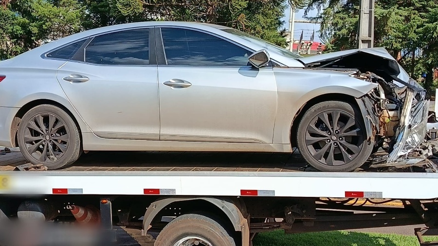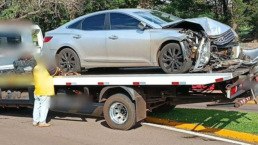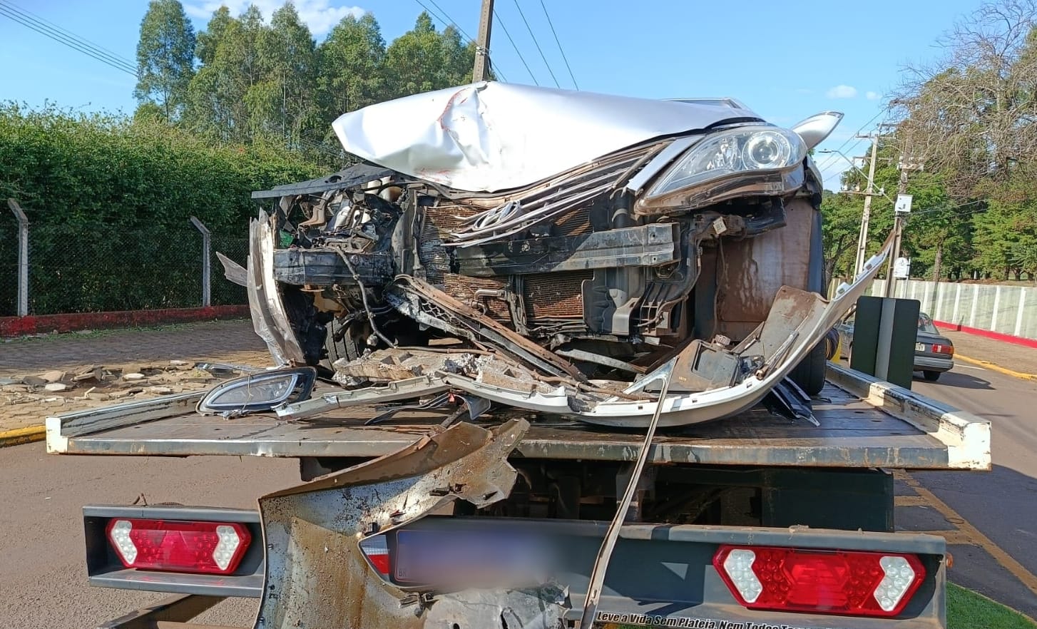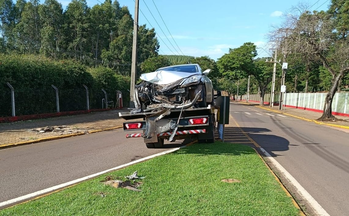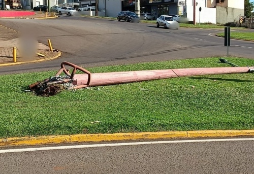 Um veículo derrubou um poste em um acidente de trânsito registrado no início da tarde desta terça-feira (17), na rotatória da Avenida Senador Attílio Fontana com a Rua dos Pioneiros, em Toledo. A colisão envolveu um Hyundai Azera.