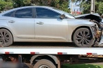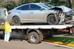 Carro derruba poste após acidente em rotatória na Avenida Senador Attílio Fontana