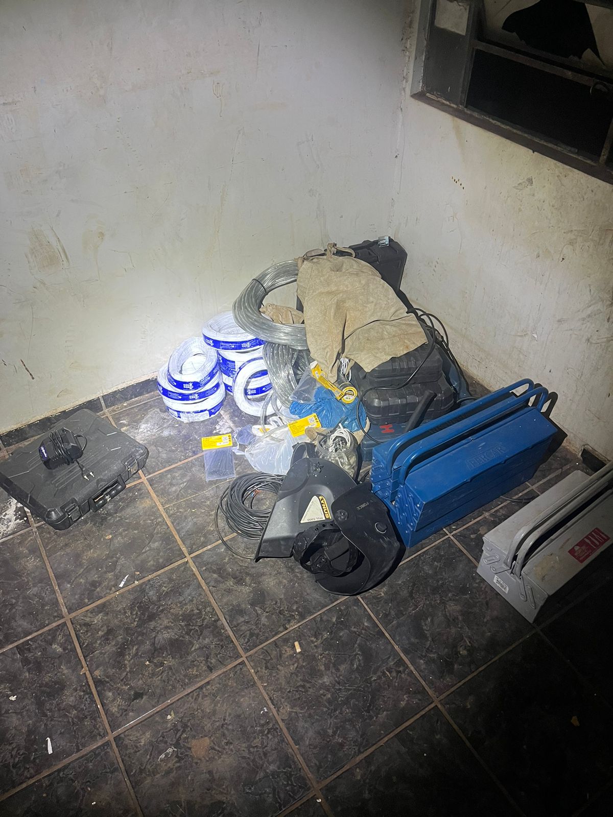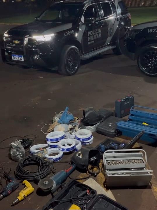 Mais tarde, já durante a noite, os policiais seguiram diligências e encontraram parte dos materiais roubados em uma residência no Jardim Coopagro. Diversas caixas de ferramentas, rolos de cabos elétricos e utensílios utilizados na construção civil foram apreendidos.