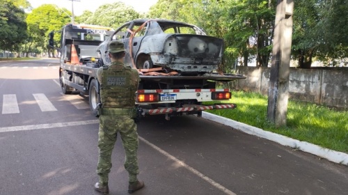 Populares acionaram o Batalhão de Polícia de Fronteira (BPFron) depois de ouvirem disparos de arma de fogo. A equipe policial se deslocou até o local e constatou que o veículo, um GM Astra, estava completamente destruído pelo fogo.