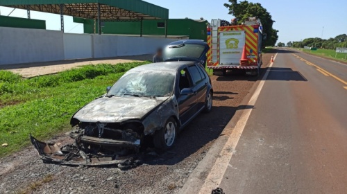 Um Volkswagen Golf ficou parcialmente destruído após pegar fogo na rodovia PR-182, que liga Toledo ao município de Palotina, na tarde desta segunda-feira, 06.