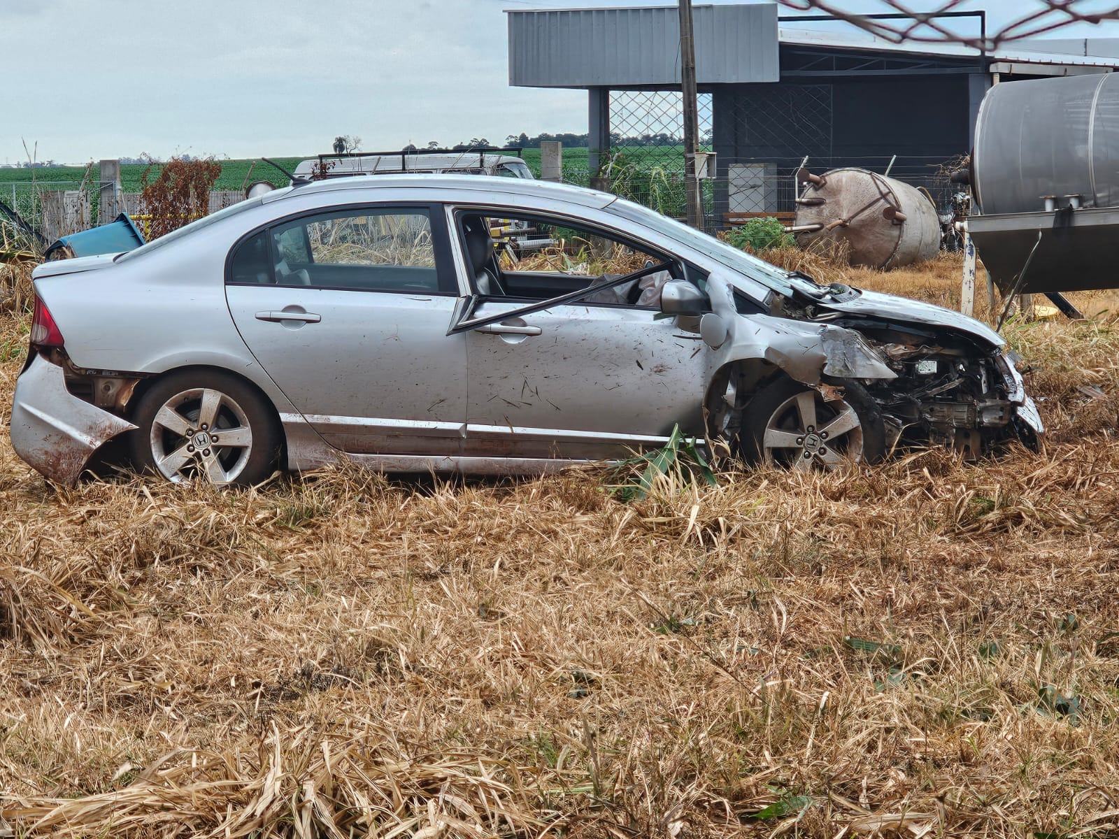 O carro que trafegava de Marechal Cândido Rondon a Toledo saiu da estrada, atravessou a pista no sentido contrário, passou por um milharal, invadiu o portão de uma empresa, rompeu uma cerca e só parou ao colidir contra um barracão nas proximidades.