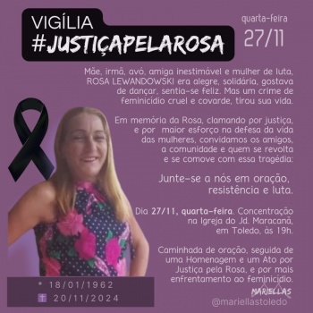 Nesta quarta-feira, dia 27 de novembro, familiares, amigos e membros da comunidade de Toledo se reunirão para uma vigília em memória de Rosa Lewandowski, de 61 anos, vítima de um brutal caso de feminicídio que chocou a cidade. O evento, marcado para às 19h00, terá início na Igreja São João Batista, localizada na Rua Arlei Leonardi, N° 499, no Jardim Maracanã, com uma caminhada de oração seguida de homenagens e um ato por justiça.
