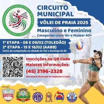 Estão abertas as inscrições para a 1ª etapa do Circuito Municipal de Vôlei de Praia 2025, que será realizada nos dias 08 e 09 de fevereiro, nas quadras do Toledo Futebol Clube (Clube Toledão). O evento marca a retomada de uma tradição esportiva local, realizada no final da década de 1990 e início dos anos 2000.