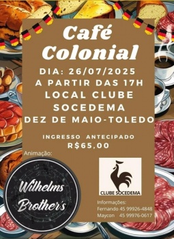 O Café Colonial do Clube Socedema é reconhecido por sua organização e pela qualidade dos produtos servidos, mantendo viva a cultura gastronômica dos colonizadores da região. Informações adicionais e reservas de ingressos podem ser feitas pelos telefones e WhatsApps (45) 9-9926-4848, com Fernando, ou (45) 9-9976-0617, com Maycon.