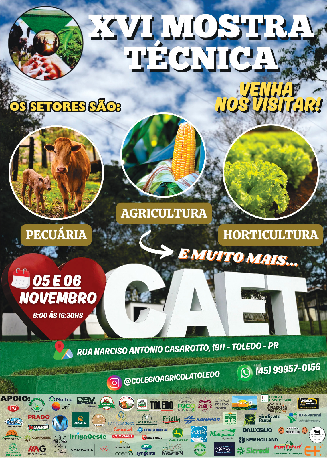 O evento ocorre na sede do colégio, localizada na Rua Narciso Antonio Casarotto, Nº 1911, em Toledo, e conta com o apoio de diversas empresas e instituições ligadas ao agronegócio e à educação técnica. Mais informações sobre o evento podem ser adquiridas pelo telefone e WhatsApp (45) 9-9957-0156 ou ainda pelo Instagram: @colegioagricolatoledo.