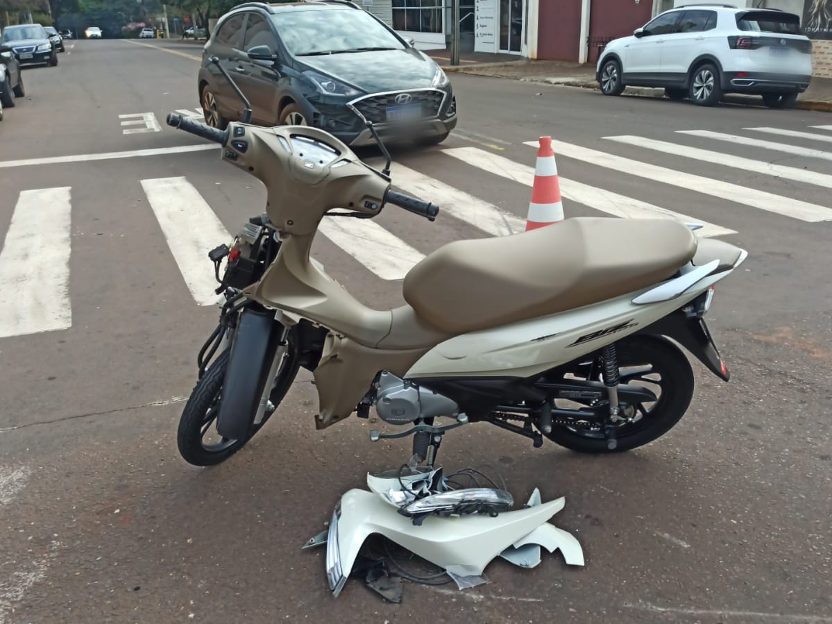 A batida entre a moto Honda Biz e o carro Toyota Yaris aconteceu no cruzamento da Rua Santos Dumont com a Rua General Alcides Etchegoyen.