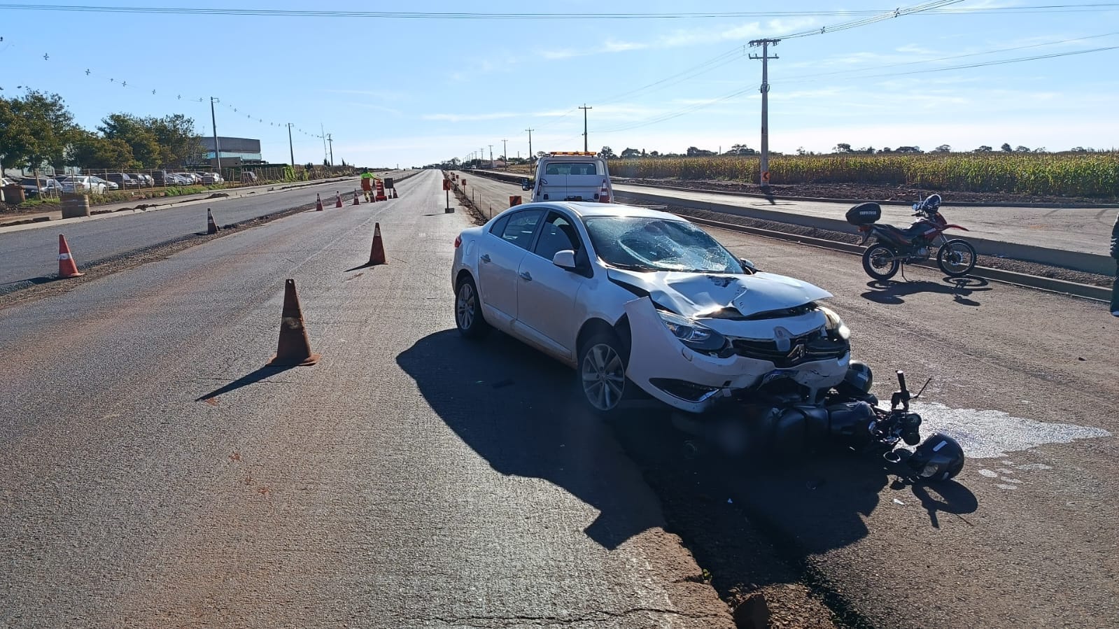 Duas pessoas ficaram feridas em um acidente de trânsito registrado no início da tarde desta quinta-feira (12). A colisão envolveu uma motocicleta Honda CG Titan 150 e um veículo Renault Fluence e ocorreu na Avenida Egydio Jeronymo Munaretto, prolongamento da rodovia PR-317 em direção a saída para a BR-163, trecho em obras de duplicação.