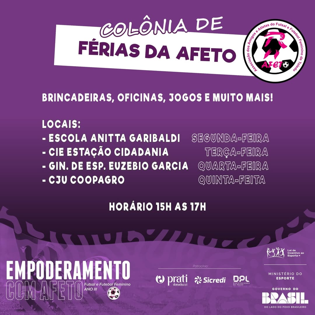A Colônia de Férias integra o projeto “Empoderamento com Afeto: Futsal e Futebol Feminino – Ano III”, desenvolvido pela Afeto, e é viabilizada por meio da Lei de Incentivo ao Esporte, do Governo Federal, com realização do Ministério do Esporte. A iniciativa conta com o patrocínio da Prati Donaduzzi, Sicredi Progresso PR/SP e DPL Atacado, reforçando o compromisso com ações de inclusão social, esporte e desenvolvimento humano por meio do afeto e da convivência.