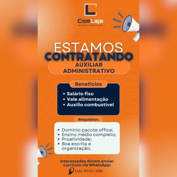 A ComLaje – Pré-fabricados e Artefatos de Cimento está contratando Auxiliar Administrativo para vaga presencial em Toledo, com local de trabalho na saída para Novo Sobradinho. A oportunidade é preferencialmente feminina e exige transporte próprio.
