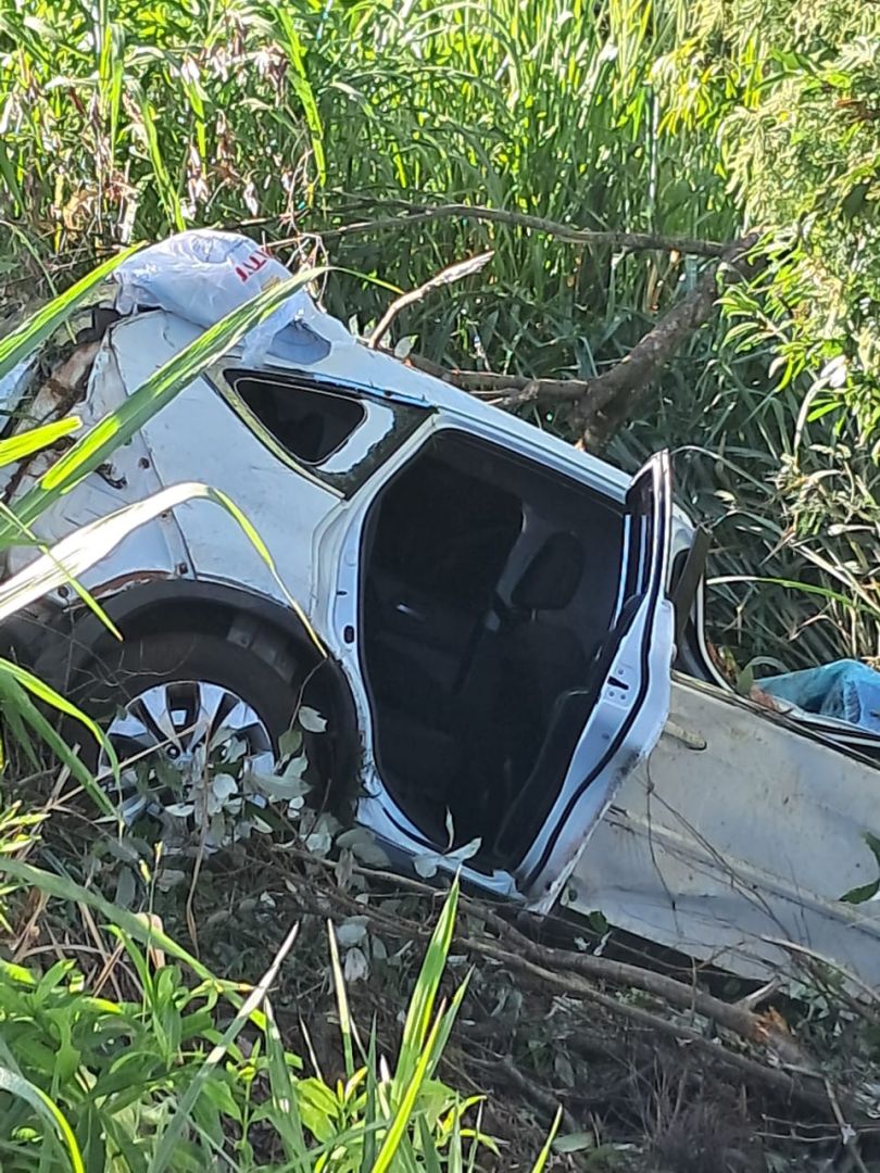 O carro acabou capotando e caiu em um barranco, ficando completamente destruído. Os maiores danos foram principalmente no teto sobre o motorista, que foi todo esmagado.
