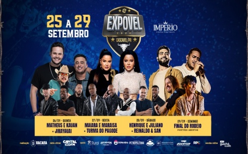 A EXPOVEL 2024 ocorrerá de 25 a 29 de setembro na Sociedade Rural de Cascavel (Expovel) com shows de: Matheus & Kauan, JiraYauai, Maiara & Maraisa, Turma do Pagode e Henrique & Juliano. Esta edição promete ser a maior da história, com uma estrutura de palco, telão, algo inédito em Cascavel.