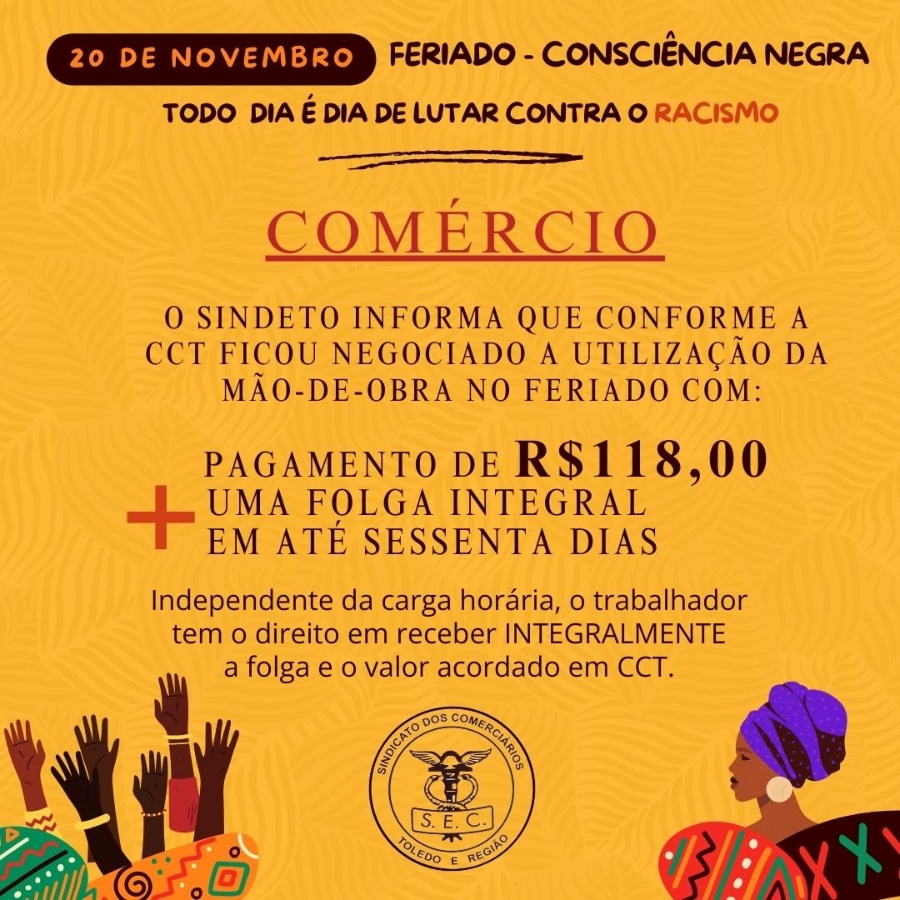 O comércio varejista em geral no município de Toledo terá o seu funcionamento facultativo nesta quarta-feira, 20 de novembro, feriado de Dia da Consciência Negra.