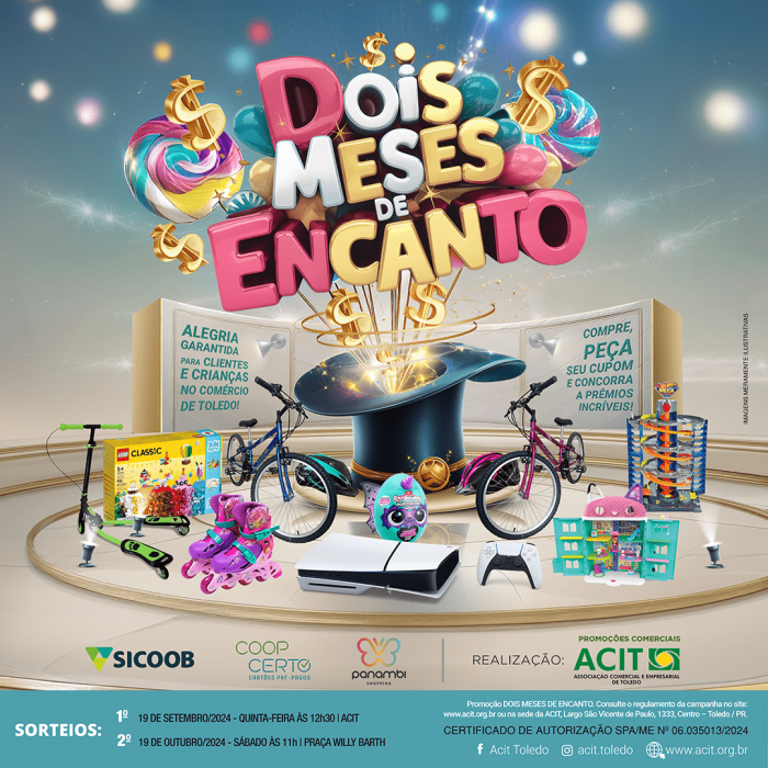 O primeiro sorteio da campanha ‘Dois Meses de Encanto’, que abrange as datas comemorativas do Dia do Cliente e Dia das Crianças, ocorreu nesta quinta-feira (19), às 12h30 na sede da Associação Comercial e Empresarial de Toledo (ACIT) e teve transmissão ao vivo nas redes sociais da entidade.