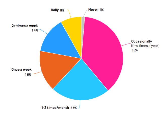 Como se pode ver, 38% tentam a sorte nos jogos de cassino online com dinheiro real ocasionalmente, isto é, poucas vezes ao ano. Enquanto, 23% aposta 1 ou 2 vezes por mês, 16% uma vez por semana, 14% mais de duas vezes por semana e 8% diariamente. Além disso, 1% dos brasileiros nunca aposta em jogos de cassino online.