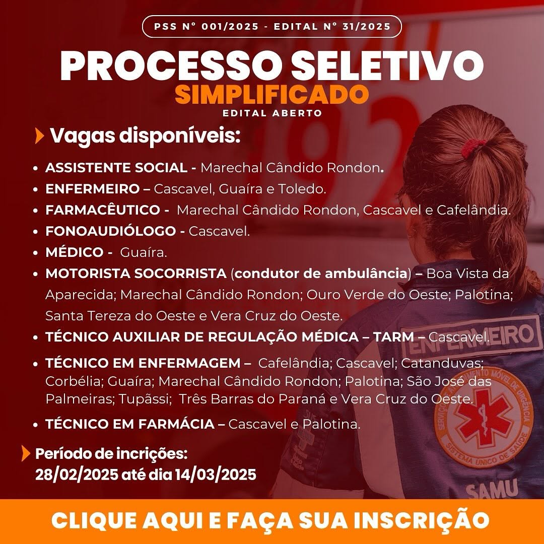O Consórcio de Saúde dos Municípios do Oeste (Consamu) abriu inscrições para o Processo Seletivo Simplificado (PSS) de Nº 001/2025 – Edital de Nº 031/2025. As inscrições vão até 14 de março de 2025 e devem ser feitas exclusivamente pela internet CLICANDO AQUI.