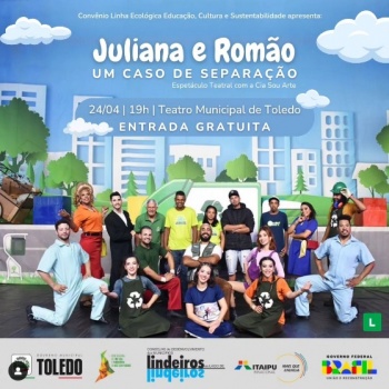Na quarta-feira, dia 24 de abril, às 19h00, o Teatro Municipal de Toledo recebe o espetáculo "Juliana e Romão - um caso de separação", uma produção da Companhia SouArte. A entrada é gratuita para todos os interessados.