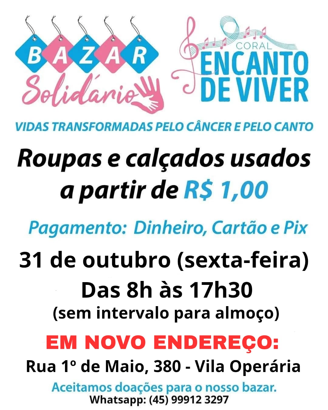 O Bazar Solidário, principal fonte de renda mensal do Coral Encanto de Viver, é responsável por manter as atividades sociais e culturais da associação. Nele, são comercializadas roupas e calçados usados a partir de R$ 1,00, com pagamento aceito em dinheiro, cartão e Pix. “Além de gerar recursos, o bazar ajuda muitas famílias que encontram aqui peças em bom estado por preços acessíveis. É uma ação que une solidariedade e sustentabilidade”, comentou Arlete.