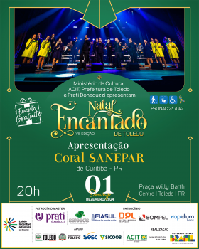 No próximo domingo, 1 de dezembro, às 20h, a Praça Willy Barth será palco de uma apresentação especial do Coral Sanepar durante o VII Natal Encantado de Toledo.