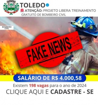 O Corpo de Bombeiros de Toledo emitiu um alerta à população sobre uma publicação falsa que tem circulado nas redes sociais no município, anunciando um curso para Bombeiro Civil com 198 vagas e remuneração de R$ 4.000,58. A publicação utiliza os brasões da Prefeitura de Toledo e do Corpo de Bombeiros Civil, o que tem gerado confusão entre os interessados.