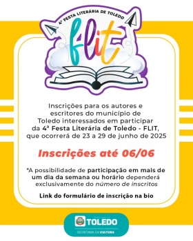 A Secretaria da Cultura de Toledo, por meio da Biblioteca Pública Municipal, abriu o período de credenciamento de escritores locais para participação na 4ª edição da Festa Literária de Toledo (FLIT). O evento será realizado entre os dias 23 e 29 de junho de 2025 e promete movimentar a cena cultural da cidade com uma programação diversificada de encontros, lançamentos, oficinas e exposições.