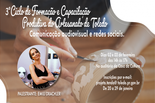 A Secretaria da Cultura de Toledo promove, nos dias 2 e 3 de fevereiro (quarta e quinta-feira da próxima semana), o “3º Ciclo de Formação e Capacitação Produtiva do Artesanato em Toledo”. O evento será realizado das 14h às 17h no auditório da Casa da Cultura (Rua XV de Novembro, 1638 – Centro) e ministrado por Emili Drachler, graduada em Marketing Digital pela Universidade do Norte do Paraná (Unopar) e especialista em Especialização em Redes Sociais e Criação de Conteúdo, que abordará a temática “Comunicação audiovisual e Redes Sociais”.