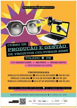 A Biblioteca Pública Municipal será palco do curso profissionalizante gratuito de gestão e produção cultural, uma formação para quem vive, cria ou trabalha com cultura, ofertado pelo Ponto de Cultura Lab Garra. O workshop será realizado em três módulos, que começam no dia 20 de outubro e seguem até 07 de novembro. A proposta é desenvolver a capacidade de compreensão e atuação nos processos da produção cultural, aliando teoria e prática para formar e qualificar novos profissionais do setor cultural paranaense.