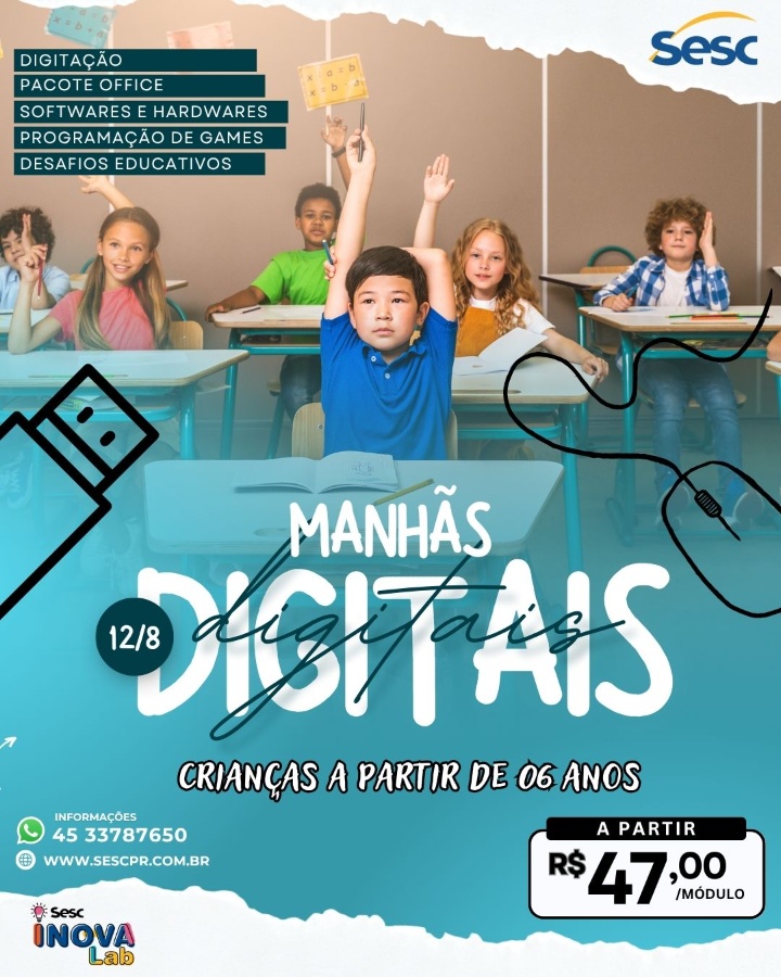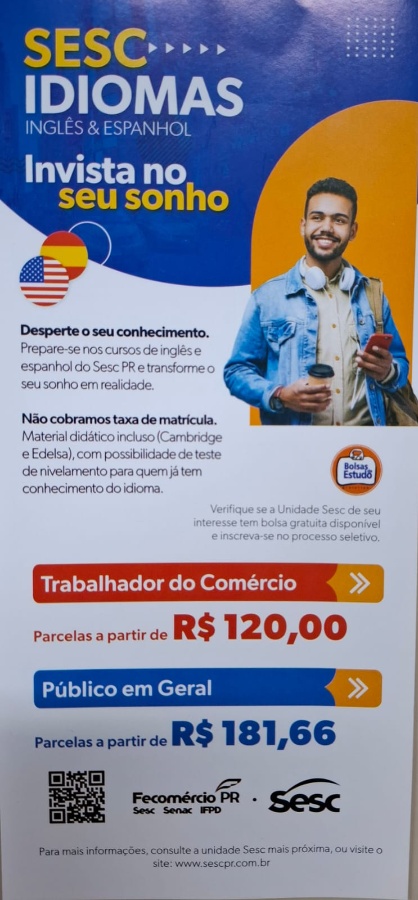 Mais informações sobre matrículas, parcelamento ou bolsas gratuitas podem ser obtidas pelo WhatsApp (45) 3378-7650 ou no site www.sescpr.com.br.