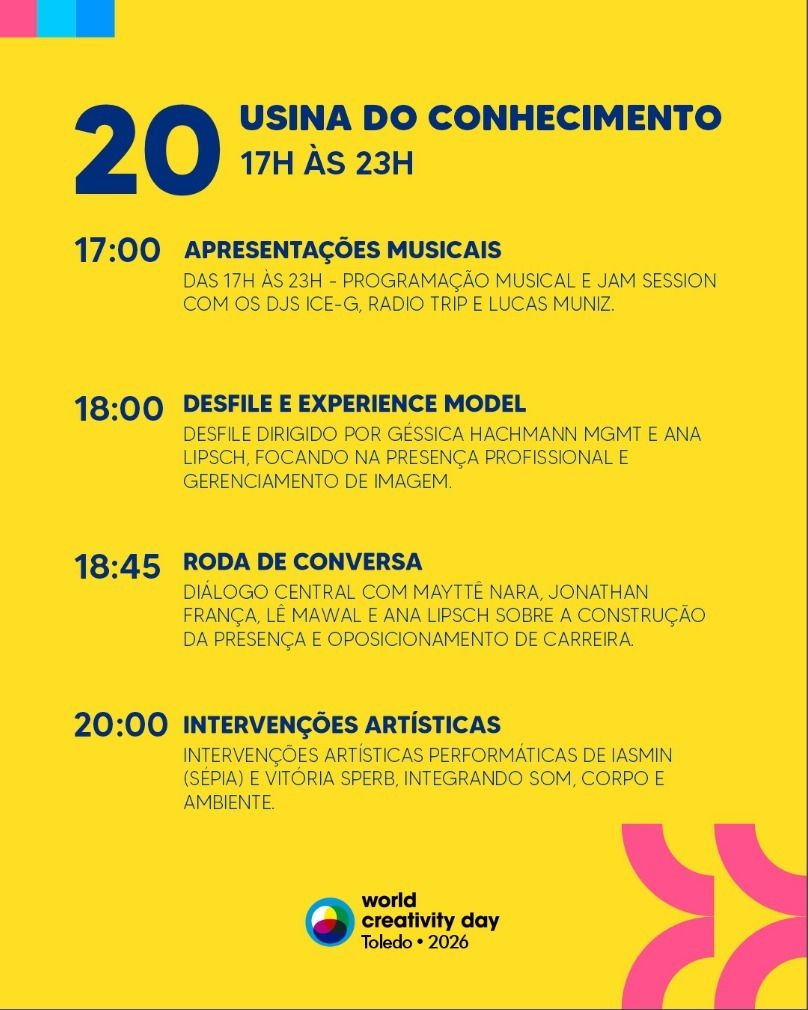 Com atividades abertas ao público, o World Creativity Day reforça a participação de Toledo em um movimento internacional realizado simultaneamente em diversas cidades, com foco na circulação de ideias e no desenvolvimento de projetos colaborativos.