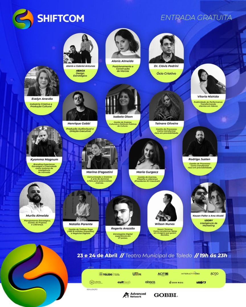 A programação segue ao longo da semana, com destaque para o SHIFT COM, que será realizado nos dias 23 e 24 de abril, no Teatro Municipal. O encontro reúne palestras e workshops gratuitos com especialistas em criatividade, estratégia, negócios digitais e produção cultural.