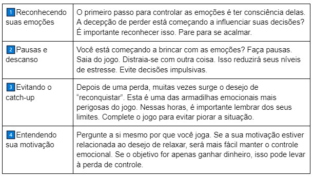 O jogo evoca uma ampla gama de emoções. Nesses momentos é fácil perder a compostura. Ações impulsivas muitas vezes levam a apostas precipitadas. O controle das emoções permite ao jogador manter uma abordagem racional do jogo. Princípios básicos de controle de emoções: