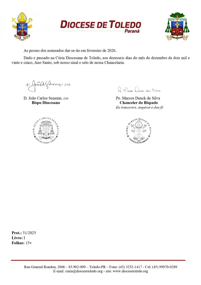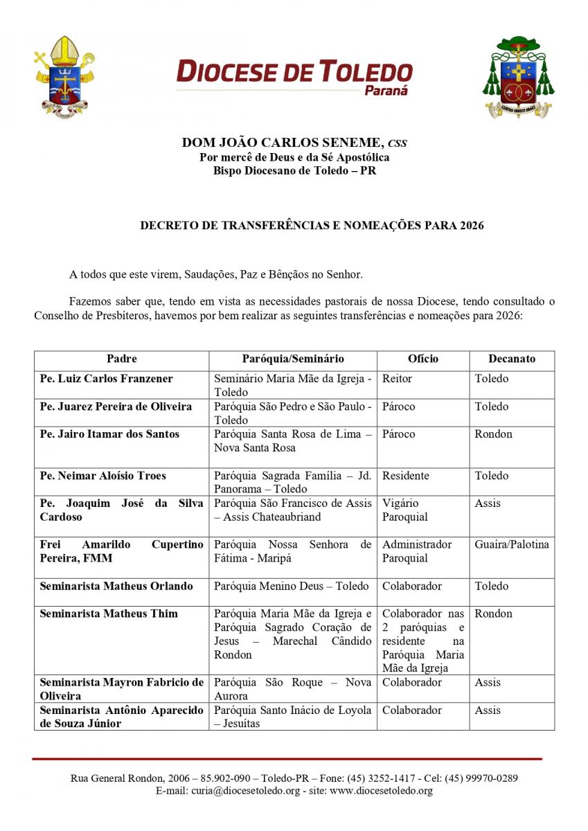 O bispo diocesano de Toledo, Dom João Carlos Seneme, publicou na tarde desta terça-feira (15), o decreto que oficializa as transferências e nomeações do clero para o ano de 2026. O documento estabelece mudanças que envolvem 10 paróquias da Diocese de Toledo, além do Seminário Maria Mãe da Igreja, e define a reorganização pastoral que passará a vigorar a partir do próximo ano.