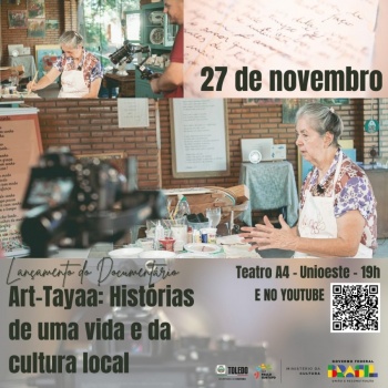 O lançamento do documentário “Art-Tayaa: Histórias de uma vida e da cultura local”, que conta a história de Edy Braun, professora aposentada da Universidade Estadual do Oeste do Paraná (Unioeste), campus de Toledo, e de outras personalidades da cultura da cidade, será exibido gratuitamente nesta quarta-feira (27), às 19 horas, no Teatro A4 da Unioeste de Toledo. O evento será aberto a toda a população e vai contar com a presença da protagonista, Edy, que fará exposição de outras de suas obras artísticas no local.