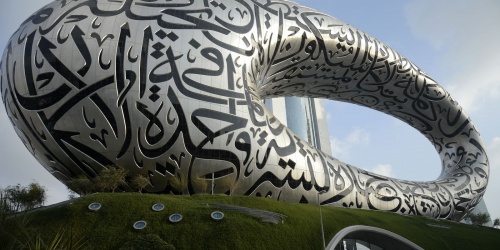 A fachada impressionante e futurista tem 77 metros de altura, ocupando uma área de 17,6 mil metros quadrados. As escritas em caligrafia árabe são poesias de Mohammed Al Maktoum, primeiro-ministro e vice-presidente dos Emirados Árabes Unidos.